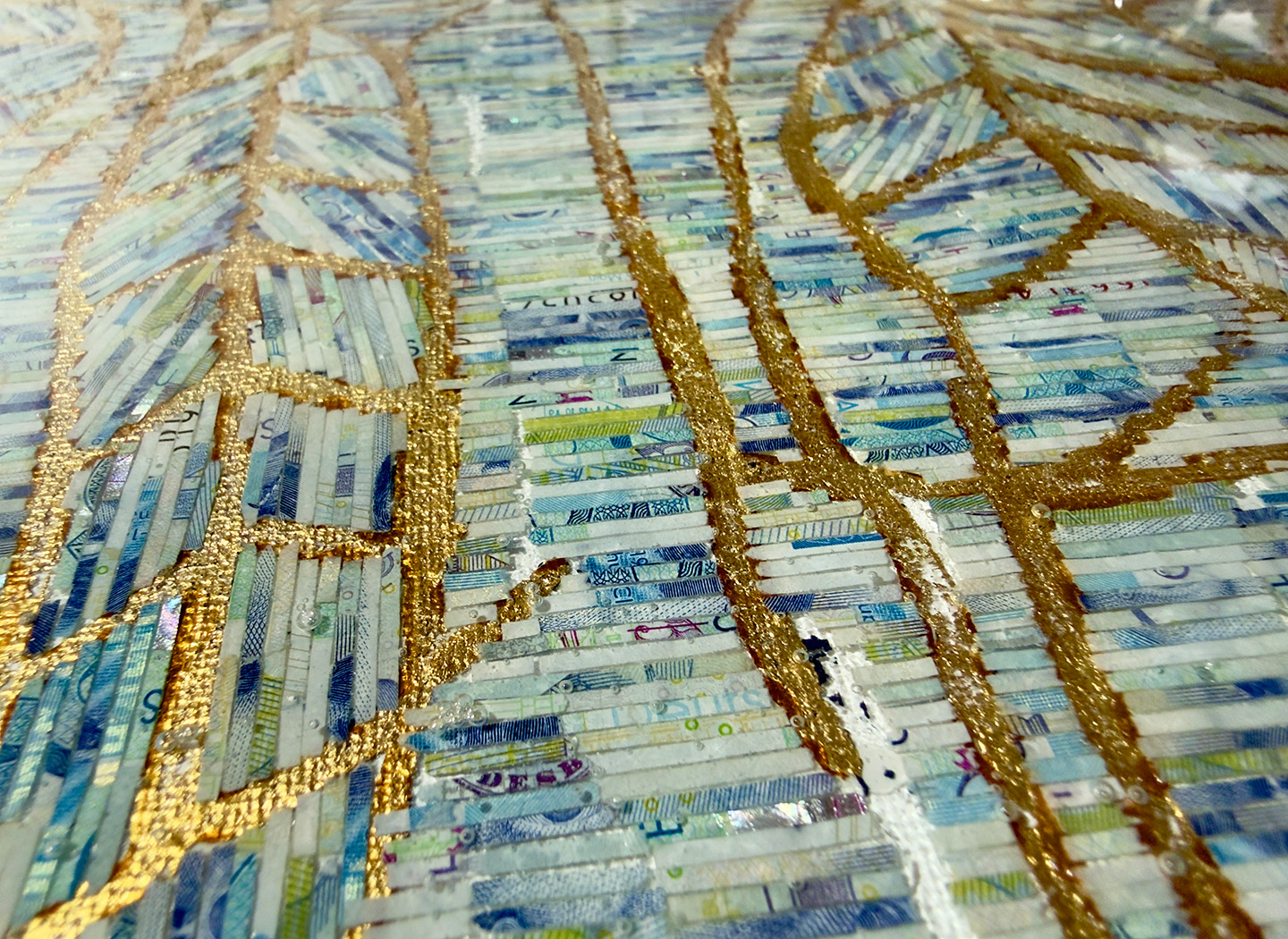 shredded currency embedded in resin on a 13"x13"x1" framed, 2024.