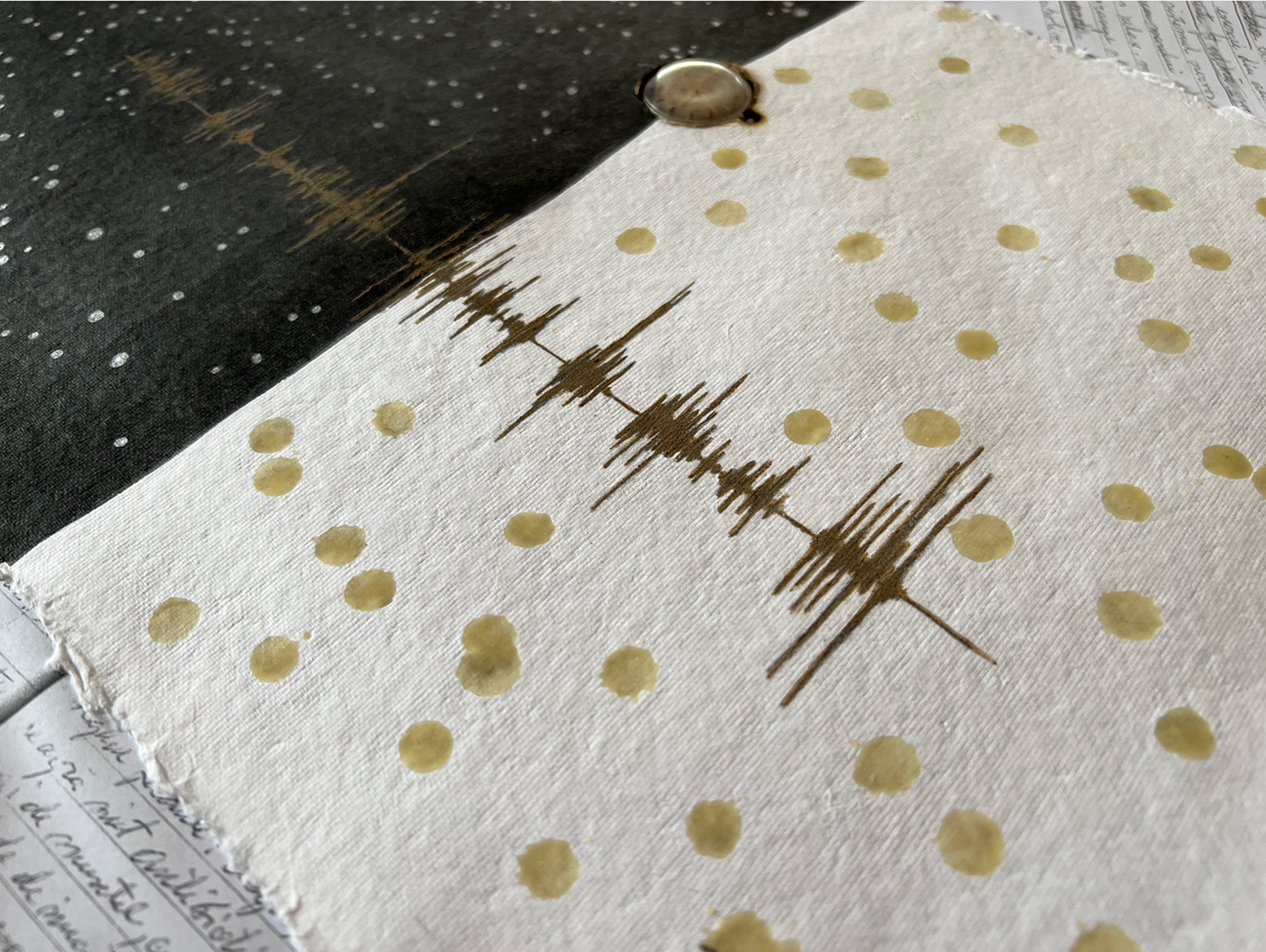 Handmade cotton rag paper, India Ink, chrome pen, soil, wax, vintage Russian watch, scanned letters (my father's handwriting) on cardboard. 22"x 18", framed, finished on June 27th, 2023.