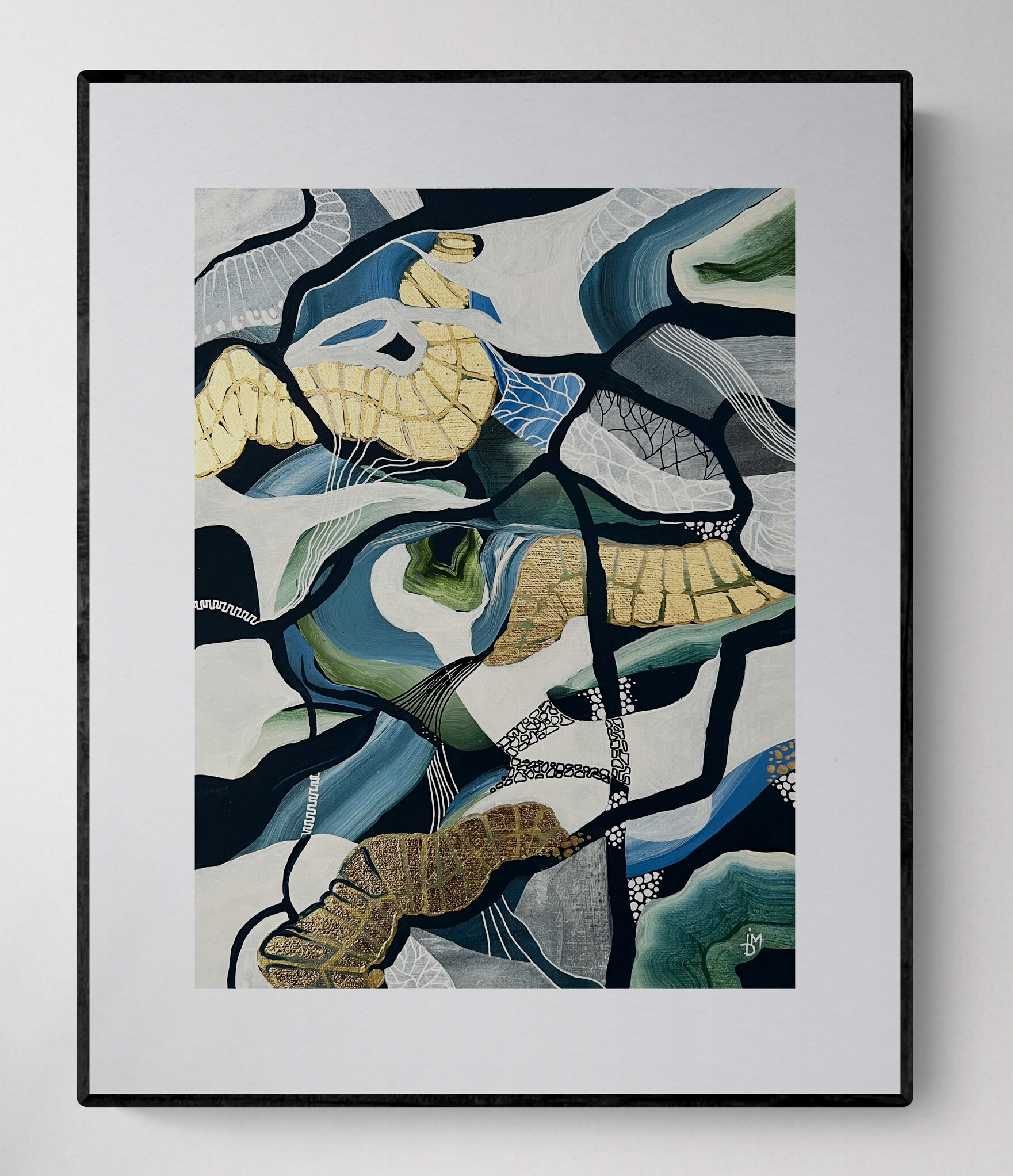 "GreenLandia No1", acrylics and gold foil on canvas, 24"x 36"x 2", 2023, unframed.