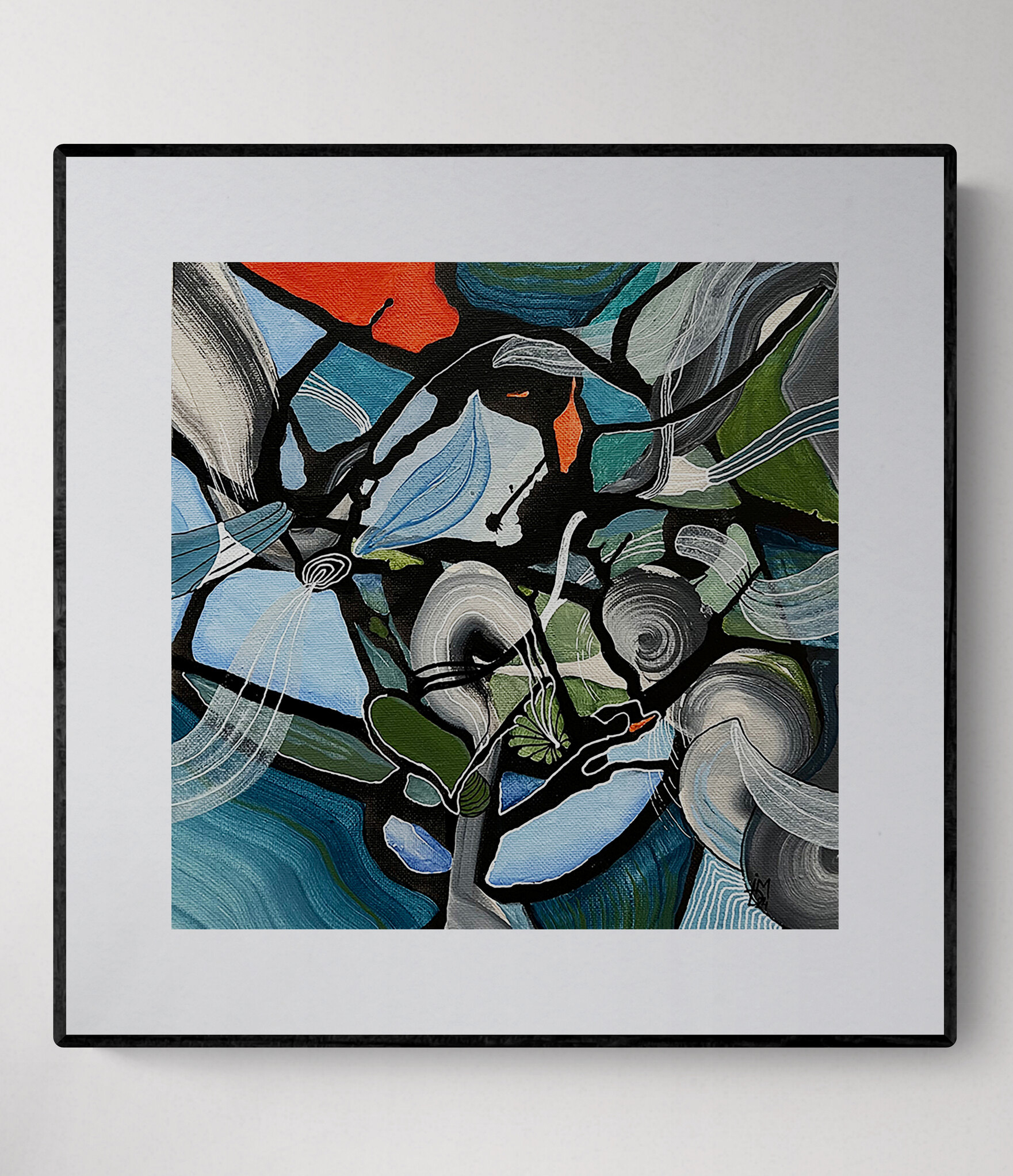 "IP No.5- The Late Winter"- acrylics, paper and painting mediums on a 30"x 30"x2", 2023 stretched canvas, framed.