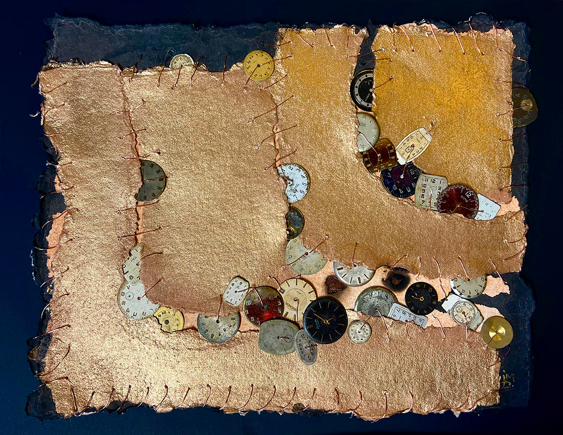 Mixed media with handmade paper, acrylic, India ink, wire, and watch faces on panel, 11'x 16", 2023.