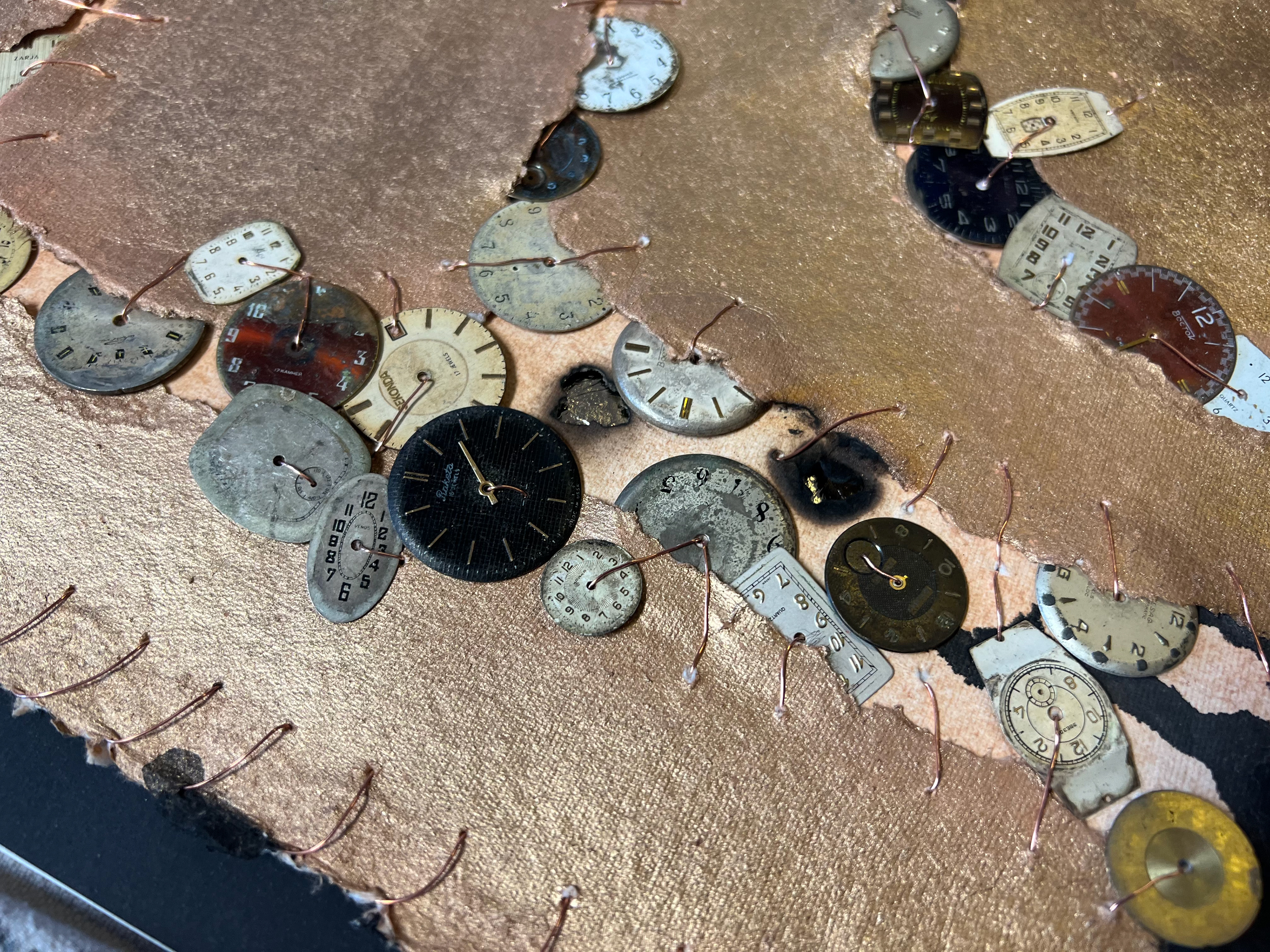 This work reflects on the fragile illusion of time as something we believe we can control, postpone, or recover. Torn handmade paper surfaces are stitched together with visible wire, suggesting both repair and restraint — an attempt to hold moments in place even as they slip away. Embedded watch faces, stripped of their function, accumulate like silent witnesses to passing hours, forgotten intentions, and delayed decisions.